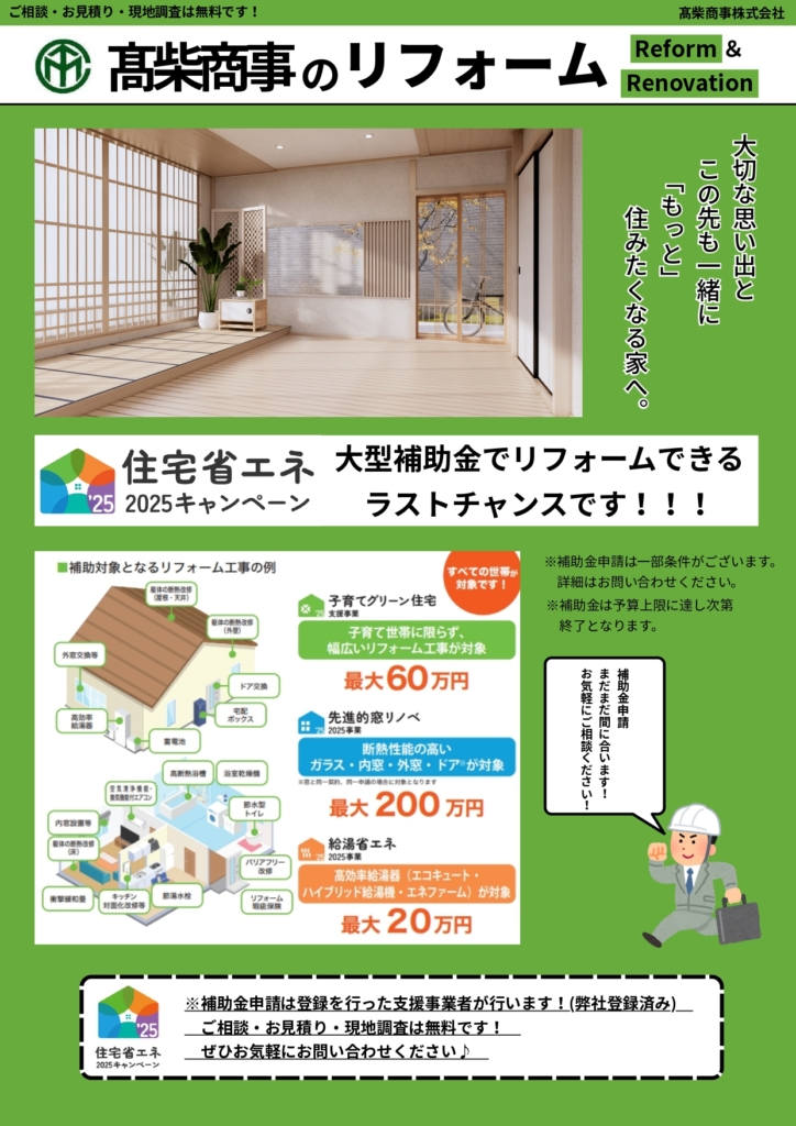 2025.06.11 お知らせ 補助金でお得にリフォームするチャンス☆ こんにちは!高柴商事株式会社 住宅事業部です(^^) 今年も早いもので、もう6月… 梅雨のシーズンになりましたね。 すっきりしない空模様が続きますが、体調に気を付けて過ごしたいものですね… さて、みなさまご自宅のお悩みはありませんか。 今年も大型補助金を利用してお得にリフォームできるチャンス!補助金申請もまだ間に合いますので、 ぜひご相談ください♪お待ちしております。